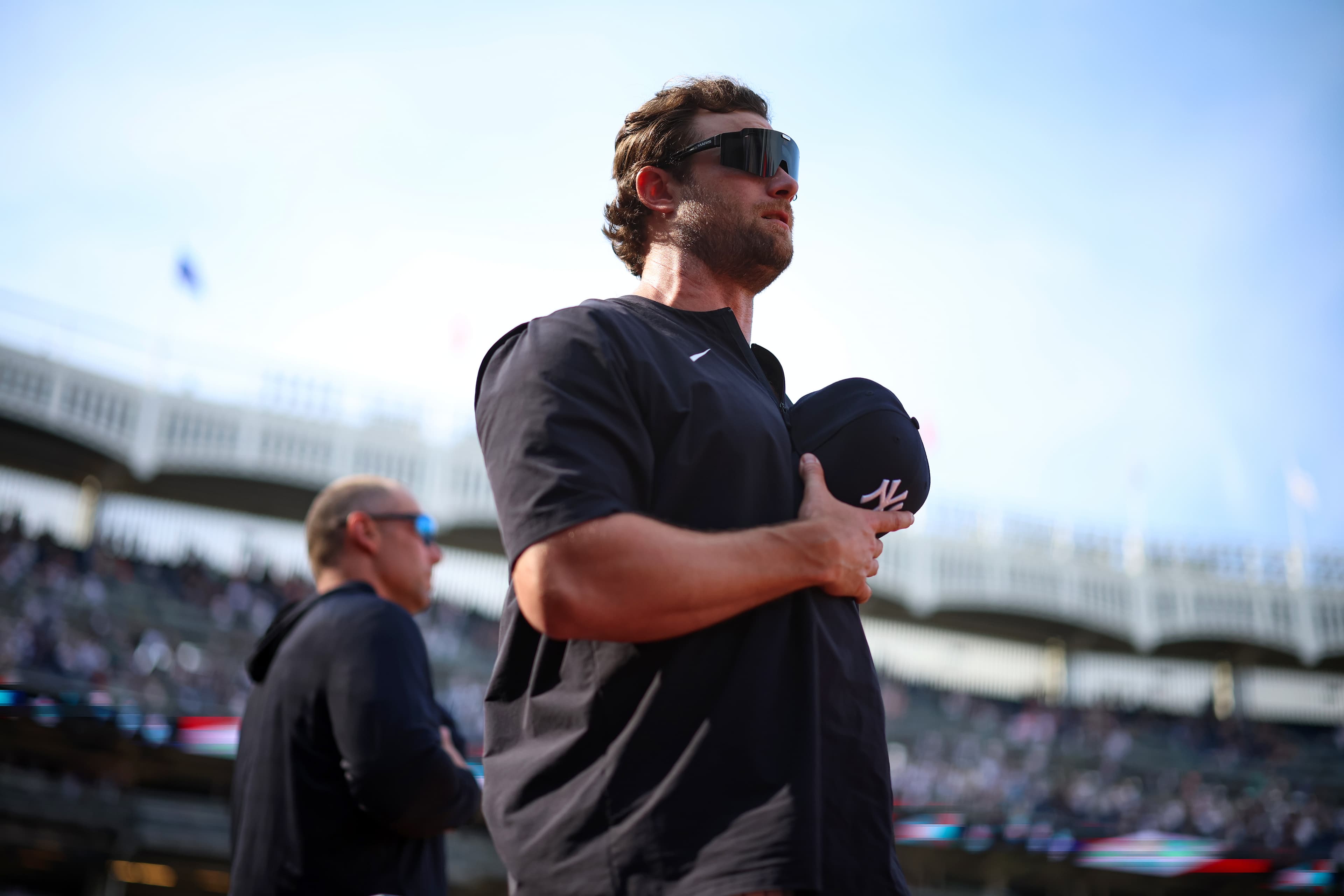 NEW YORK, NY - APRIL 16: Gerrit Cole #45 of the New York Yankees stands for the national anthem during the game against the Los Angeles Angels at Yankee Stadium on April 16, 2026 in New York, New York. (Photo by New York Yankees/Getty Images) | Getty Images MLB.com | Joe Vasile: The New York Yankees and the Hudson Valley Renegades announced yesterday afternoon that pitchers Gerrit Cole and Carlos Rodón will start for the Renegades on Thursday and Friday, respectively, as part of their rehab assignments. Cole will be making his second start, as he began his rehab assignment with the Double-A Somerset Patriots last week, while Rodón will be taking the hill for the first time this season.