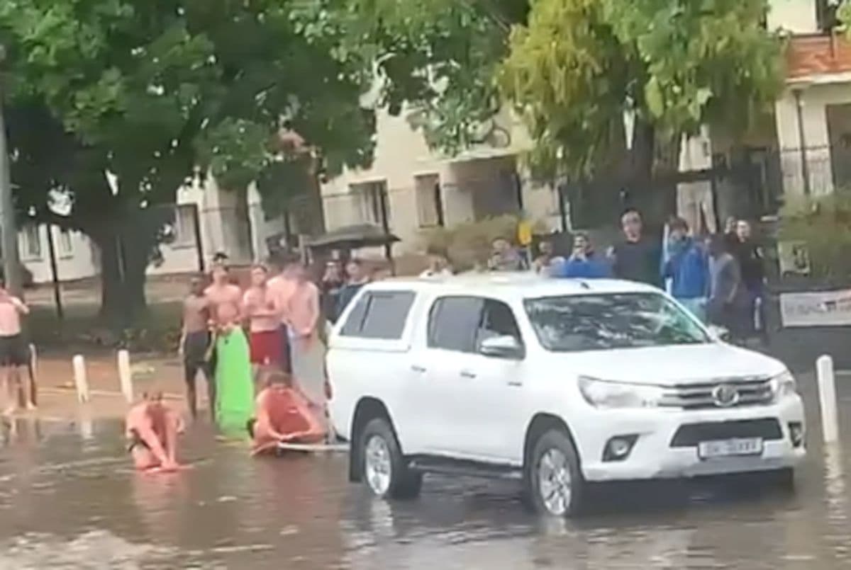 Heavy rainfall across the Western Cape over the weekend led to widespread flooding, with parts of Cape Town and surrounding areas experiencing road disruptions and waterlogged streets. In Stellenbosch, where downpours left several roads submerged, a viral video has captured a lighter moment amid the disruption – showing two students being pulled behind a bakkie while skimming across flooded road surfaces in a wakeboarding-style stunt. The clip, captioned “Stellies students as soon as it starts raining,” quickly spread on social media, drawing a mix of amusement and disbelief as the pair maintained balance while gliding through pooled water.