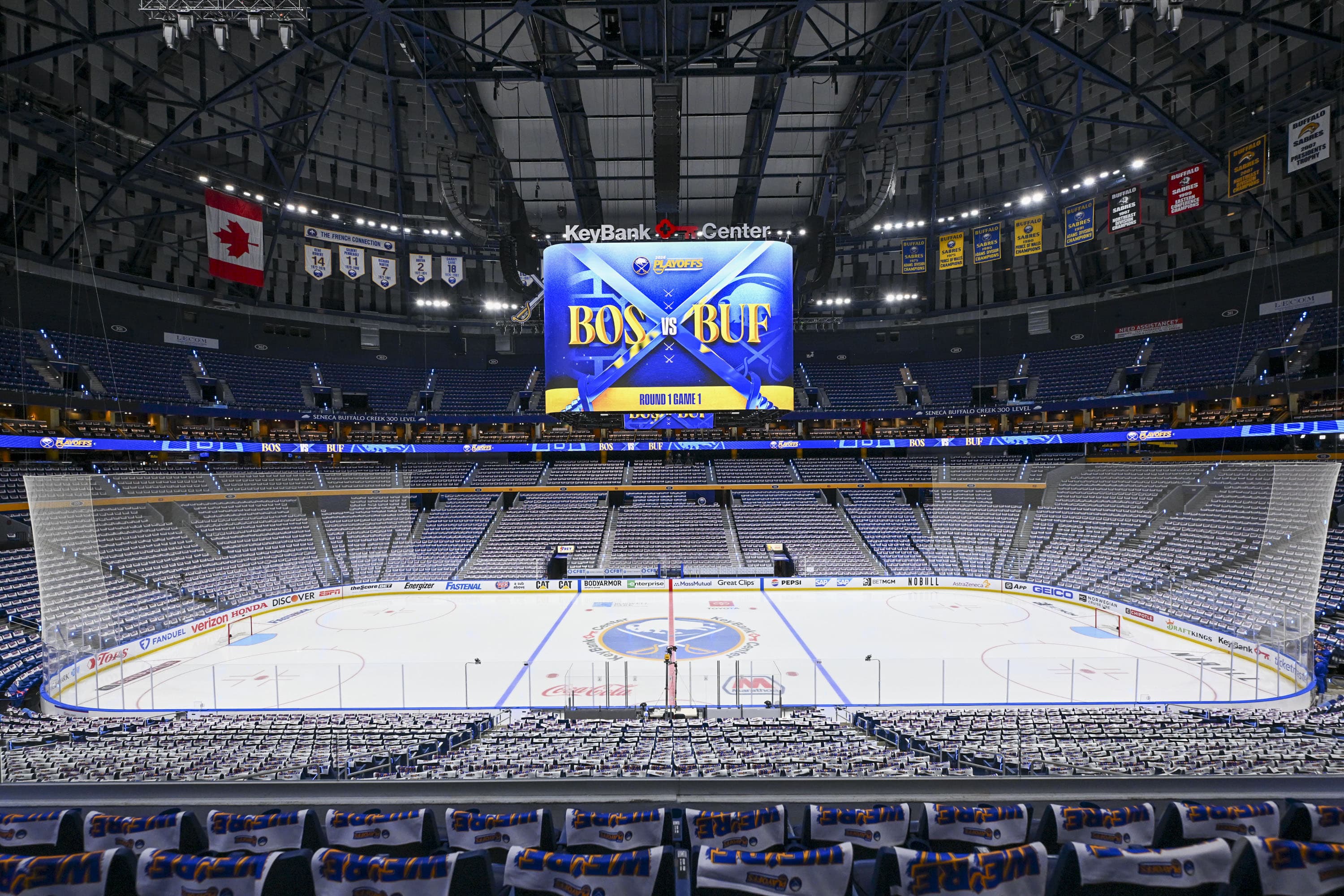 BUFFALO, NEW YORK - APRIL 19: An overall view of KeyBank Center before the game between the Buffalo Sabres and Boston Bruins during Game One of the First Round of the 2026 Stanley Cup Playoffs at KeyBank Center on April 19, 2026 in Buffalo, New York. (Photo by Joe Hrycych/Getty Images) | Getty Images Happy Tuesday, folks!If you ran the Boston Marathon on Monday, hopefully you’re feeling relatively normal today. My brother beat Zdeno Chara’s time, which means now my family must challenge him for the hardest shot title as well. If you’ll excuse me, I’ll be working on shooting a puck, say, 30 MPH first.Anyways, the Bruins and Sabres will renew acquaintances tonight.