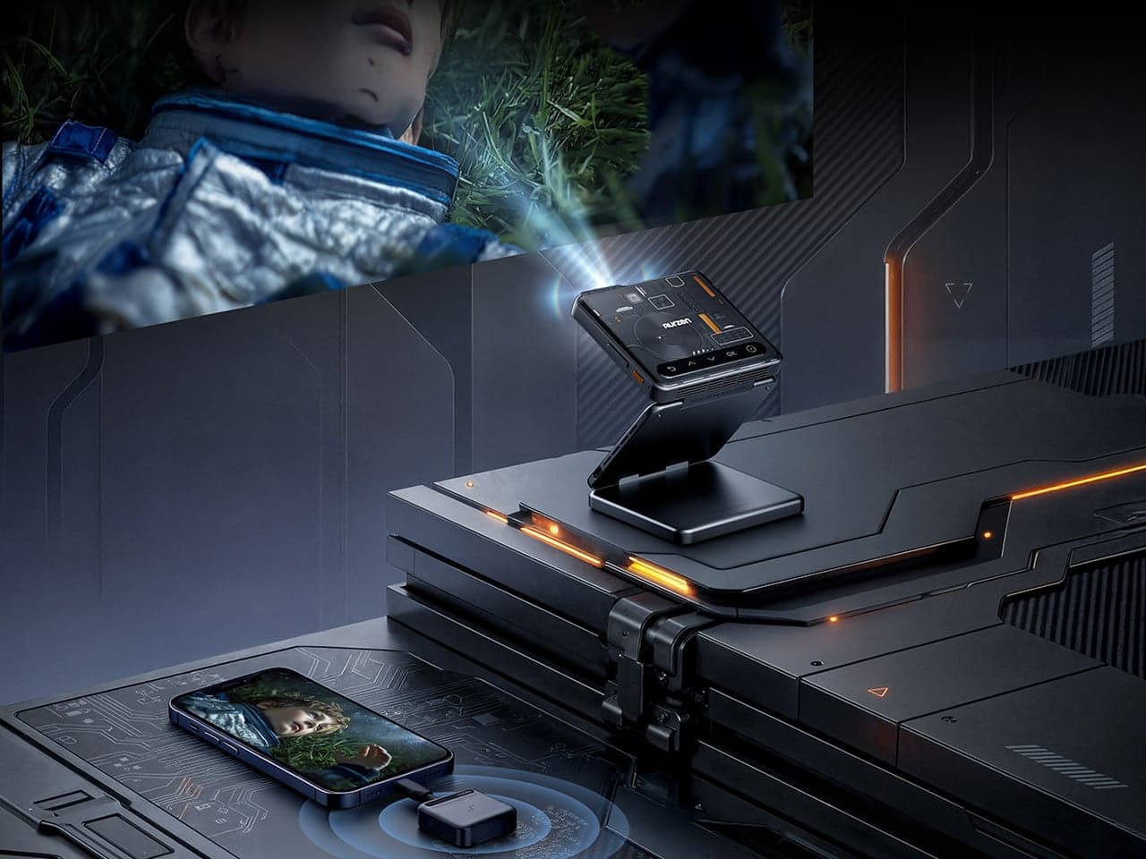 Circuit-board texturing runs across the matte black chassis, orange accent lighting traces the fold lines, and the entire device collapses down to pocket size without losing any of the visual intensity. This one was designed for people who buy gadgets the way sneakerheads buy limited drops. The Cyber Edition shares the same core DNA as the standard ZIP: a tri-fold DLP projector measuring 3.31 x 3.07 x 1.02 inches when folded, powered by a 5000mAh battery good for about 90 minutes of runtime.