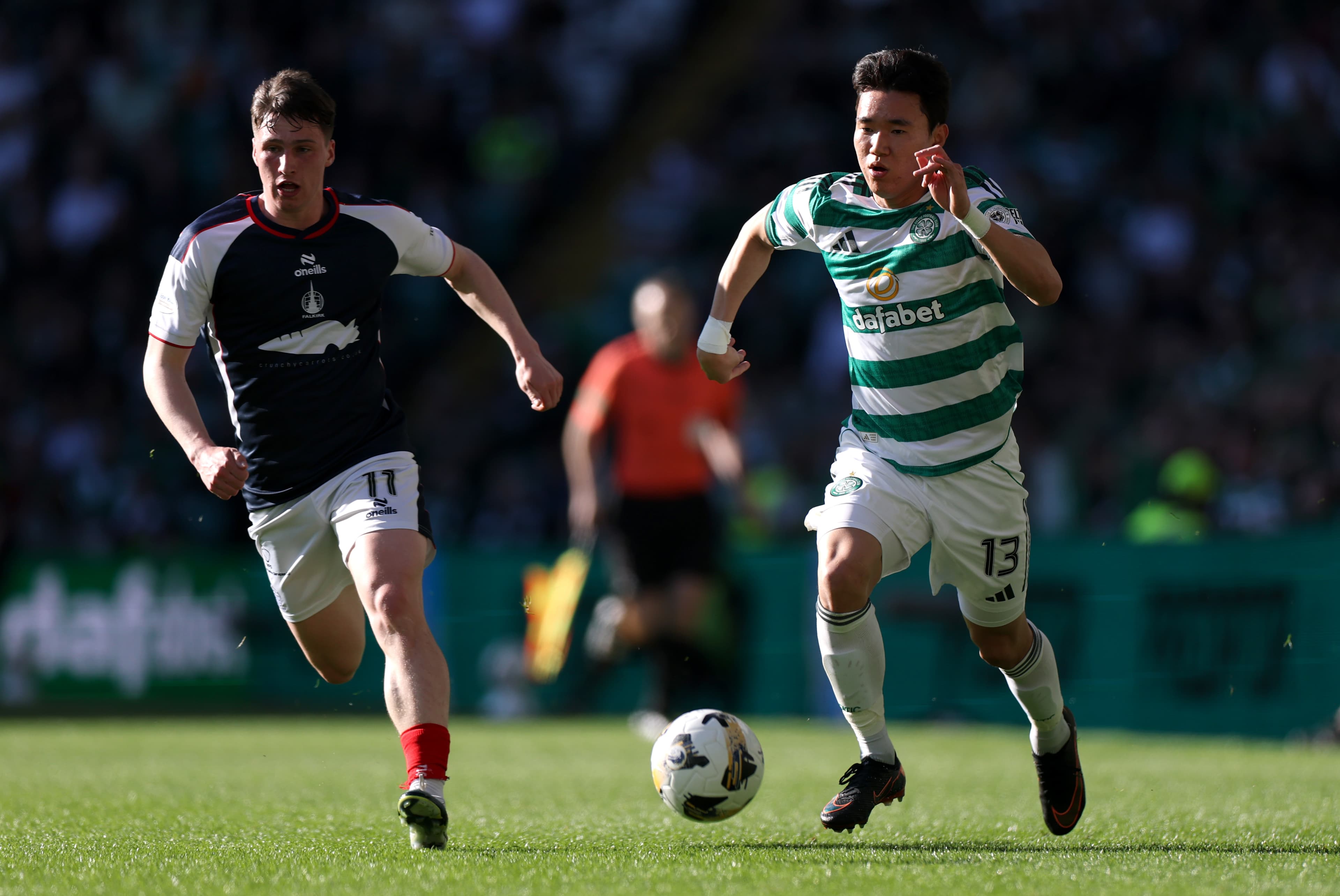 But one thing he’s managing to do before the wheels threaten to come off is stage a meaningful period of domination where we can press advantage. If that’s not taken, there’s not a lot the skipper can do about it; others need to step up and gild the Easter Lilly, so to speak. Thankfully we did take just enough decent advantage of the domination he founded before his inevitable tail-off and replacement.Kieran Tierney of Celtic celebrates scoring his team’s second goal during the Scottish Premiership match between Celtic and Falkirk at Celtic Park Stadium on April 25, 2026. (Photo by Zak Mauger/Getty Images)THE TERMINATOR – 6/10 – May be ticking his games off at Celtic but let’s hope he – like Daizen – can find a flourish to leave us champions. At the moment he’s providing able assistance to the listing captain, but I’m of the notion that he’s going to have to find some extra and step-up big-time somewhere through these final games.Benjamin Nygren during the Scottish Premiership match between Celtic and Falkirk at Celtic Park on April 25, 2026. (Photo by Zak Mauger/Getty Images)NEGAN – 5.5/10 – Aye, sort of hanging around looking for spaces and pretty passes, maybe sniffing a goal out of nowhere…But he didn’t get it, bar a free-kick well saved, and that’s where he becomes a luxury that we have to wonder is affordable for the high-intensity matches looming?Yang Hyun-Jun of Celtic runs with the ball under pressure from Ben Broggio of Falkirk during the Scottish Premiership match between Celtic and