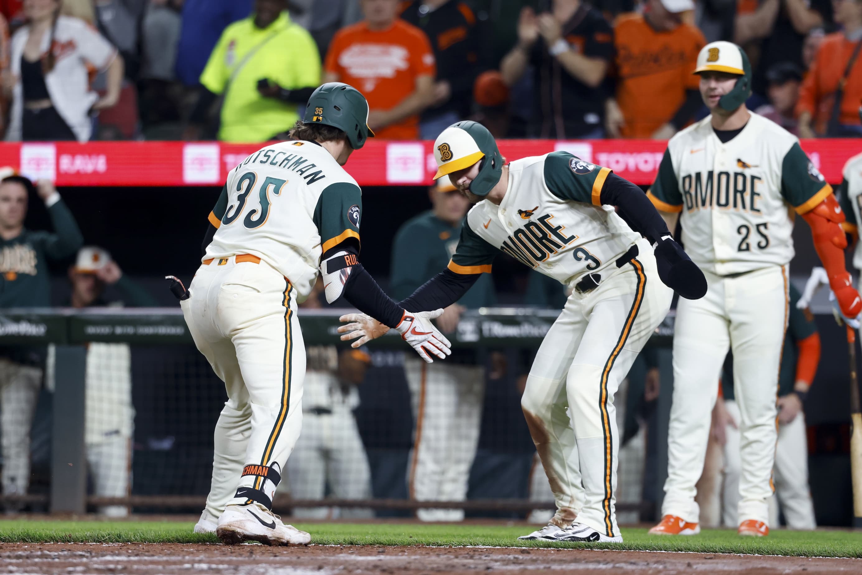 BALTIMORE, MD - APRIL 24: Adley Rutschman #35 of the Baltimore Orioles celebrates with teammate Taylor Ward #3 after hitting a home run in the fourth inning during the game between the Boston Red Sox and the Baltimore Orioles at Oriole Park at Camden Yards on Friday, April 24, 2026 in Baltimore, Maryland. (Photo by Alyssa Piazza/MLB Photos via Getty Images) | MLB Photos via Getty Images It is Friday night.The Orioles have demolished the Red Sox by a 10-3 score, a beatdown so thorough that they literally ran out of in-game pyrotechnics at Oriole Park at Camden Yards because the O’s hit so many home runs. Gunnar Henderson led off the O’s hitting in the game with a homer, Adley Rutschman hit a pair of homers, each of Taylor Ward and Samuel Basallo had four hits, Brandon Young got a second win, and the Orioles picked up 20 hits on the way to an easy against the last-place Boston Red Sox.YOU KNOW WHAT MUST BE DONE.