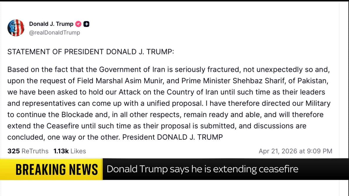 BREAKING: The U.S. will extend its ceasefire with Iran "until such time as their leaders and representatives can come up with a unified proposal", Donald Trump has said in a Truth Social post. trib.al/UamvTQB 📺 Sky 501 Video — Sky News (@SkyNews) Apr 21, 2026