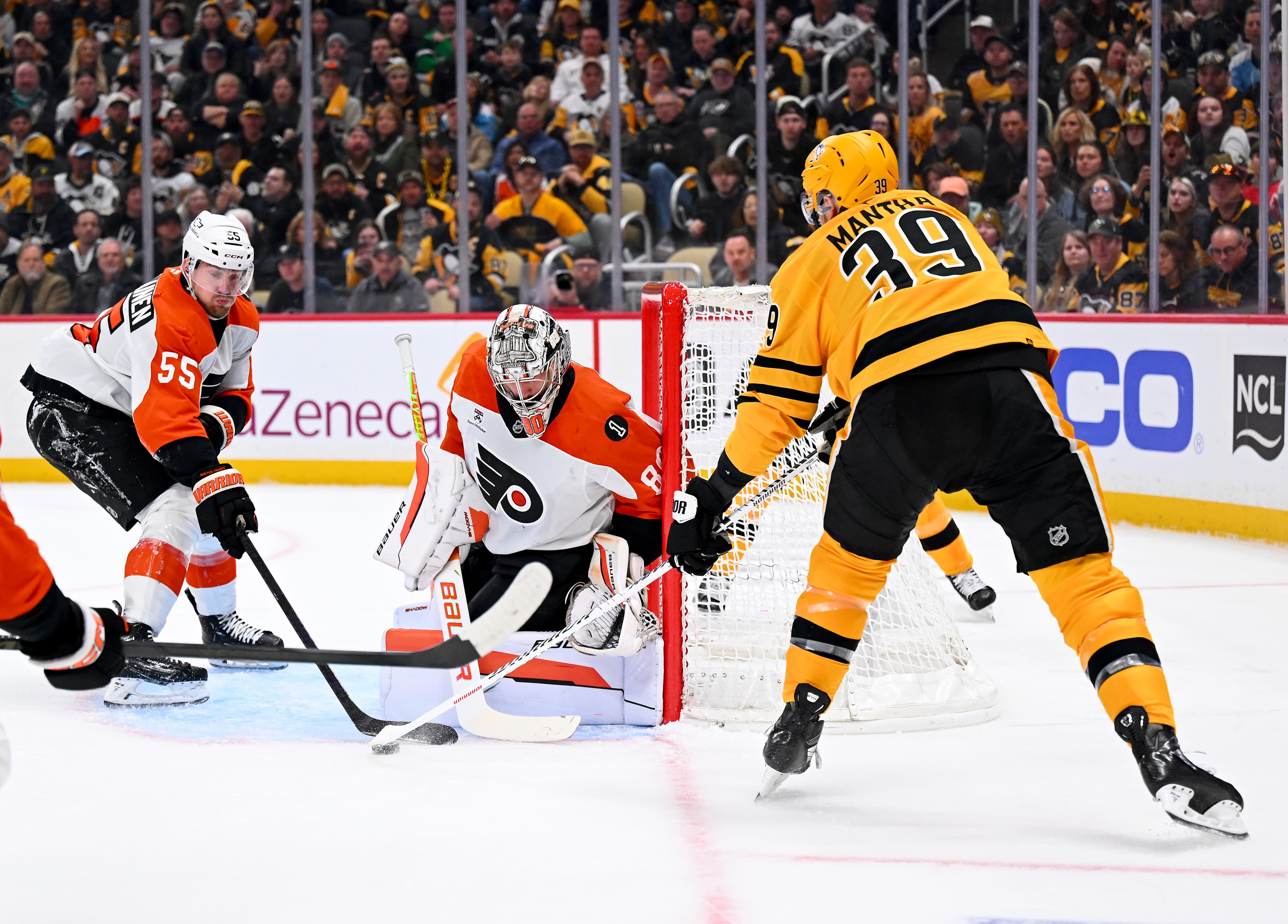 PITTSBURGH, PA - APRIL 20: Dan Vladar #80 of the Philadelphia Flyers protects the net against Anthony Mantha #39 of the Pittsburgh Penguins in Game Two of the First Round of the 2026 Stanley Cup Playoffs at PPG PAINTS Arena on April 20, 2026 in Pittsburgh, Pennsylvania. (Photo by Joe Sargent/NHLI via Getty Images) | NHLI via Getty Images The Penguins are in trouble.They’re heading to Philadelphia this week down two games in their first-round series and, barring some immediate changes, could be staring down a 3-0 hole by Wednesday night.Dan Muse and the Penguins have a few changes available to them before Wednesday, including some potential personnel changes. Here’s some possibilities:1.Shake up the power play units.The Penguins got five power play opportunities on Monday night.