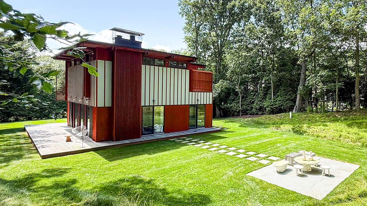 The skillfully arranged two-bedroom pavilion in the quiet Barnes Landing area maintains a compact footprint on a sculpted grassy expanse surrounded by mature trees.