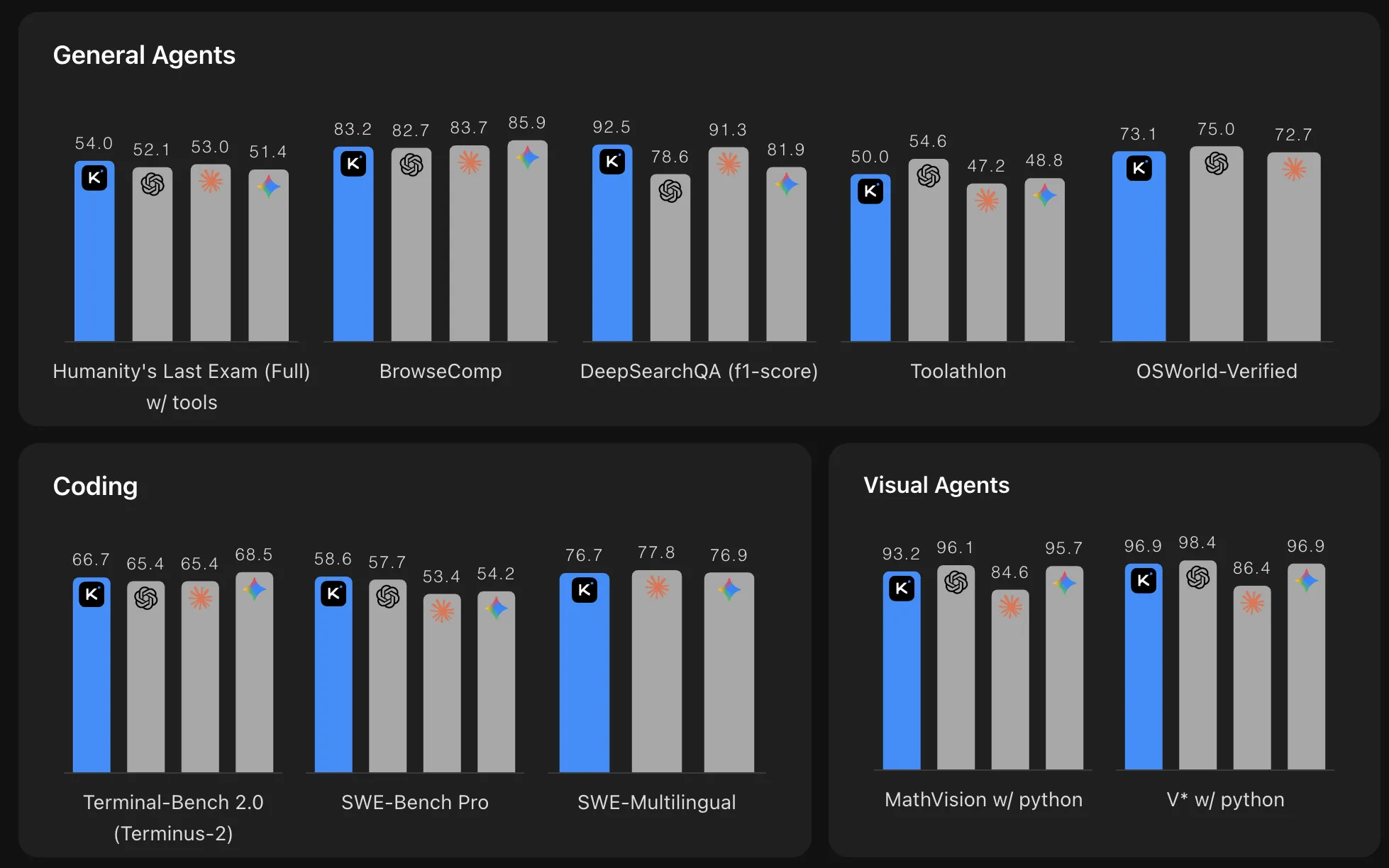 On SWE-Bench Verified it scores 80.2, sitting within a tight band of top-tier models. On Terminal-Bench 2.0 using the Terminus-2 agent framework, K2.6 achieves 66.7, compared to 65.4 for both GPT-5.4 and Claude Opus 4.6, and 68.5 for Gemini 3.1 Pro. On LiveCodeBench (v6), it scores 89.6 vs.
