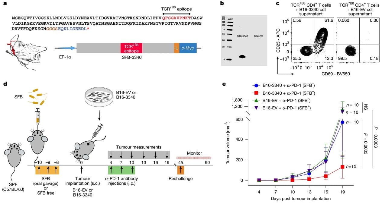 For the study mice had tumors implanted and the effect of a particular microbe (segmented filamentous bacteria, SFB) on it studied, with the presence of it markedly improving the response to anti-PD-1 treatment due to anti-gens expressed by SFB despite the large gut-skin distance. Whether in humans similar mechanisms play a similarly strong role remains to be investigated, but it offers renewed hope that cancer immunotherapies like CAR T-cell immunotherapy will one day make cancer an easily curable condition.