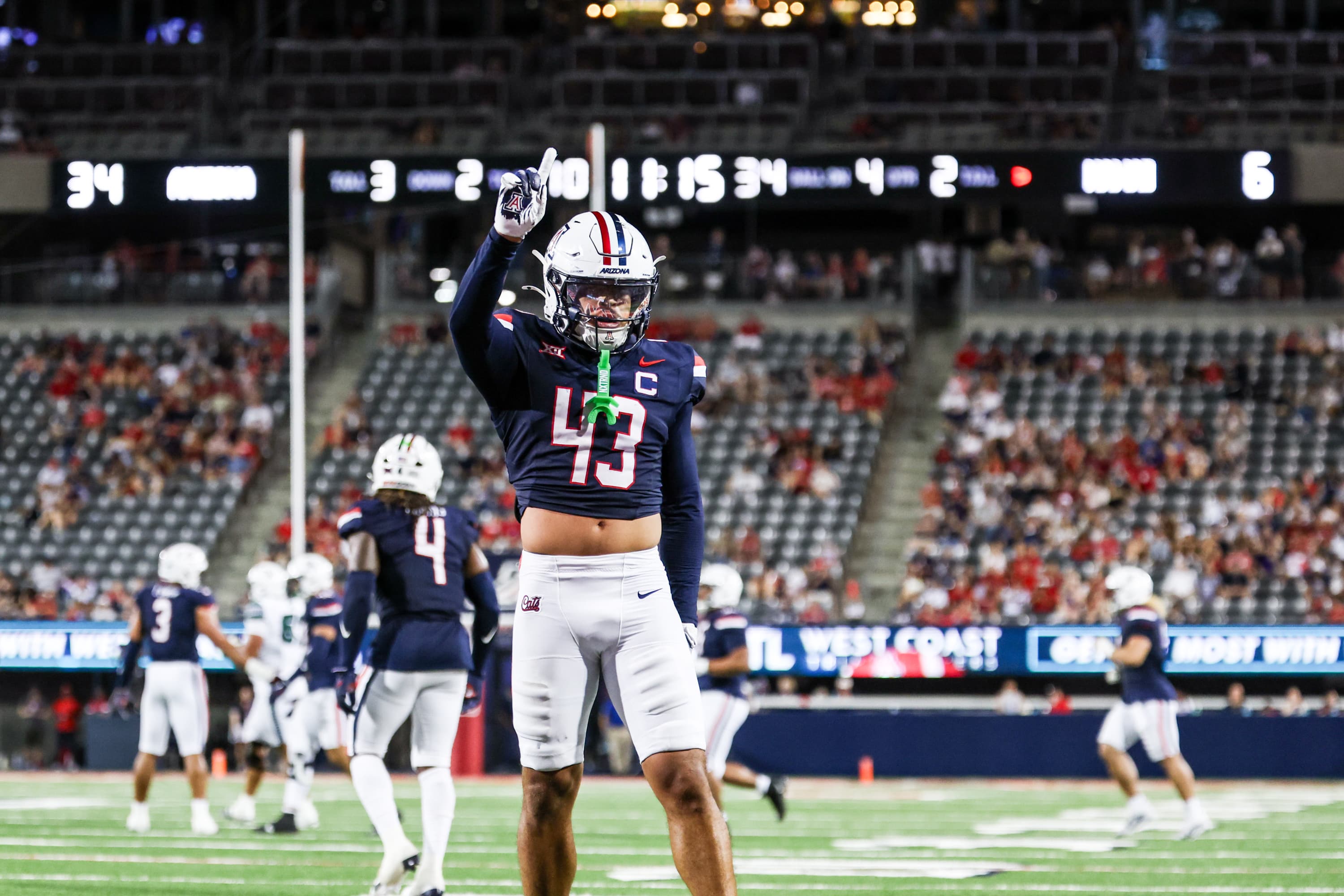 Aug 30, 2025; Tucson, Arizona, USA; Arizona Wildcats defensive back Dalton Johnson (43) waves his finger after Hawaii Rainbow Warriors fails to catch the ball during the fourth quarter of the game at Arizona Stadium. Mandatory Credit: Aryanna Frank-Imagn Images | Aryanna Frank-Imagn Images The Raiders spent their 150th overall pick, acquired from the Saints for Tyree Wilson, to select another Arizona safety in Dalton Johnson. Johnson, 23, projects as a versatile defender for the Raiders secondary and shows an ability to work across the formation, but wins primarily with his instincts, reaction skills, first step, and aggression.