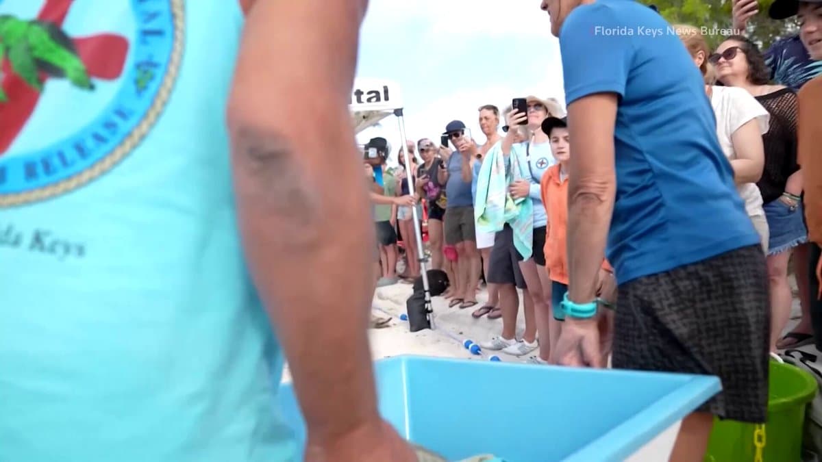 More than 200 people gathered on the beach to watch ‘Nutella,’ a green sea turtle who was tangled in fishing lines and was rescued four months ago, swim back into the sea pic.