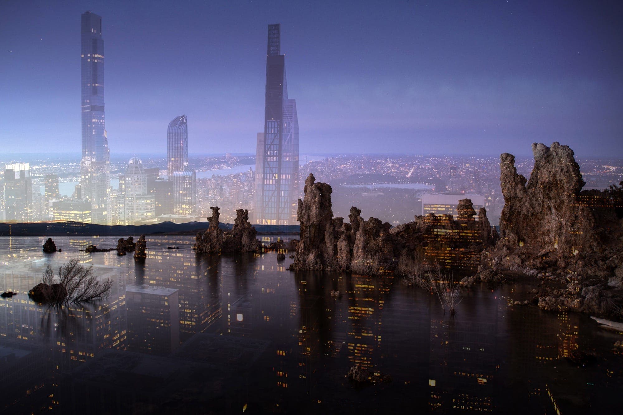 The project revolves around images in which two distinct digital photographs converge in a composite, drawing on the film technique of double exposure and exploring ideas of permanence, presence, and the “space between different scales of time,” the artist says. The Time Between highlights iconic skylines like Manhattan and Chicago, pairing the outlines of skyscrapers and city lights with dramatic rock formations and atmospheric effects. “The process is intentional but restrained, combining the two frames through careful blending rather than constructing or artificially generating new elements,” Baraty tells Colossal.