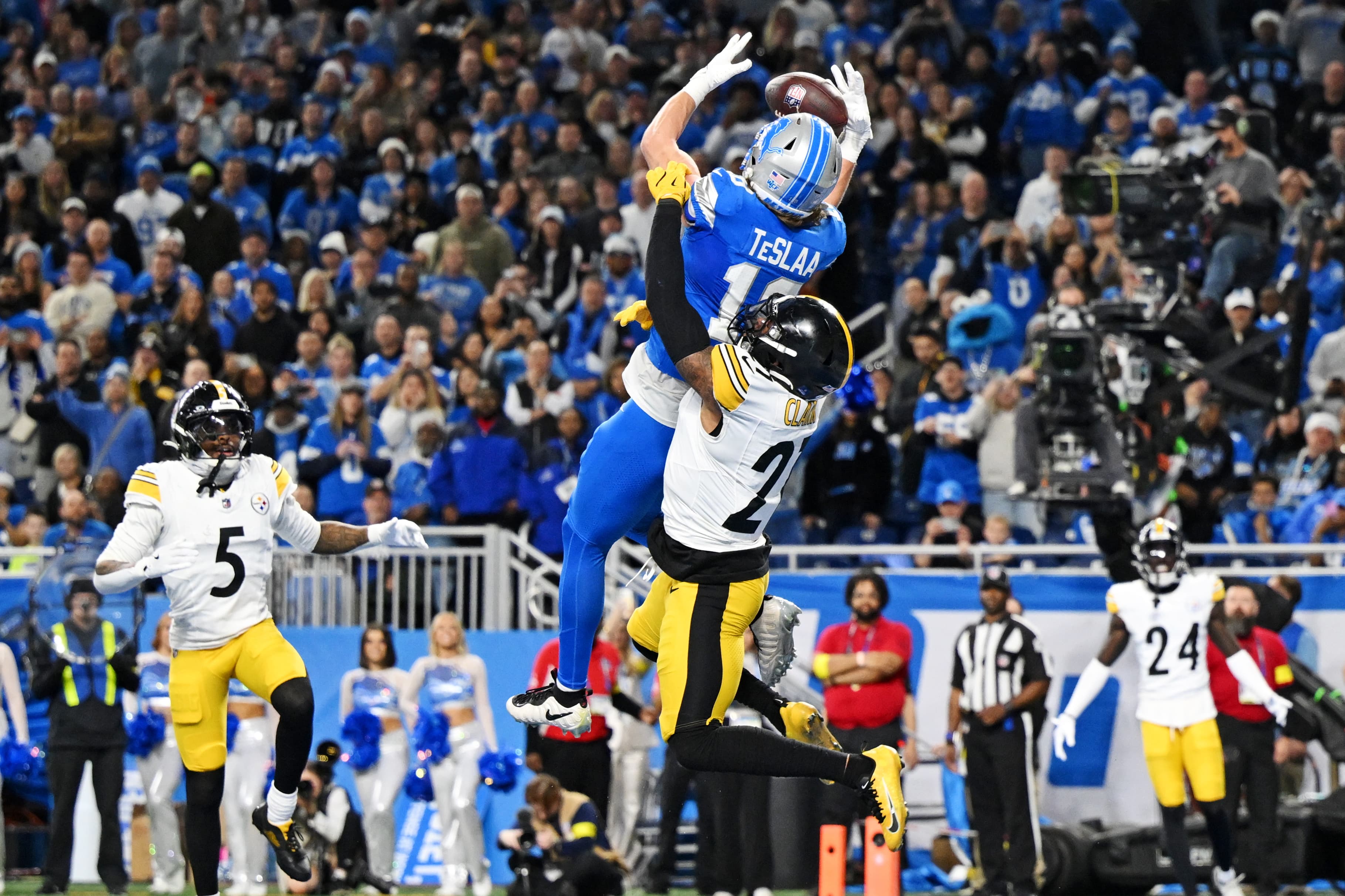 Dec 21, 2025; Detroit, Michigan, USA; Detroit Lions wide receiver Isaac Teslaa (18) attempts to catch a game winning pass but fails against Pittsburgh Steelers safety Chuck Clark (21) during the fourth quarter at Ford Field. Mandatory Credit: Lon Horwedel-Imagn Images | Lon Horwedel-Imagn Images General manager Brad Holmes and the Detroit Lions have never been afraid to make bold moves, and they did exactly that last offseason in a major trade up on draft day for wide receiver Isaac TeSlaa.Detroit moved up 30 spots last April to acquire TeSlaa atop the third round, sending away a pair of future picks to the Jacksonville Jaguars to get their wide receiver.