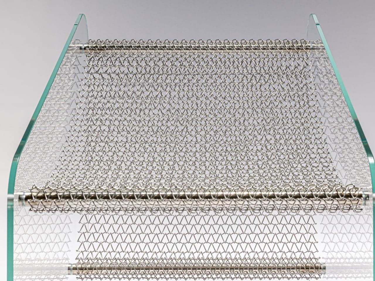 The metallic mesh doesn’t try to hide itself or disappear behind the glass. It asserts its presence, and the contrast between hard structure and transparent surface is the entire point. Industrial and elegant at once, which is a balance that is genuinely difficult to achieve without one quality undermining the other.