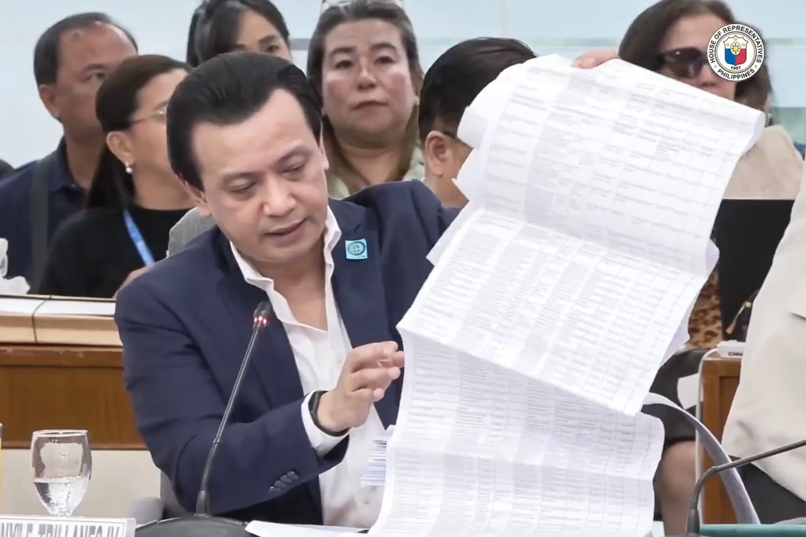 Trillanes attended the hearing with the bank records he has had with him for the past 10 years. LONG LIST. Former senator Antonio Trillanes IV testifies during the House of Representatives justice committee hearing on the impeachment against Vice