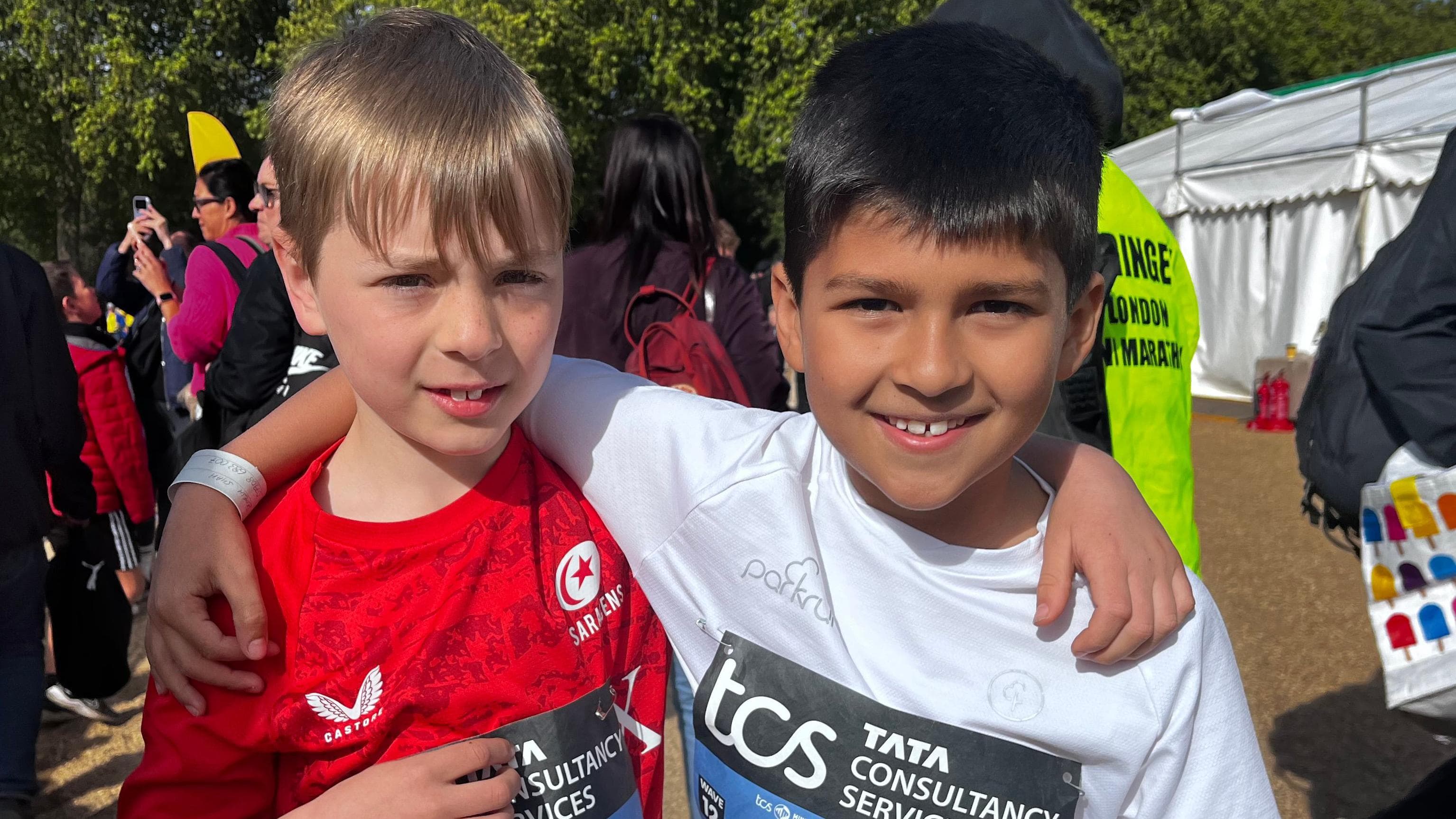 Alicia, who has asthma, said she trained for the race in her local parks [BBC]Thousands of children across London have been sharing in the running excitement, with the TCS Mini London Marathon.Open to children from Reception age to Year 12, the annual event on Saturday welcomed 20,000 runners and formed part of the London Marathon weekend.The event, which started at Horse Guards Parade and finished on The Mall, included either a mile or 1.6-mile distance which children could jog, walk or wheel.Alicia from south London told BBC London she was "very excited" to run the Mini Marathon, and had been training for the race in her local parks."I'm feeling a bit nervous at the same time, because it's my first time doing it," she added. "I've got quite a few friends who are running it with me."Eddie and Harry hoped to run the race together [BBC]Friends Eddie and Harry, from Enfield, said they would try to run the race together.Harry added: "I'm feeling good, I think I'll get a good time."We both love running in school."Another runner, Cameron, said he loved trying to beat his own records when competing.