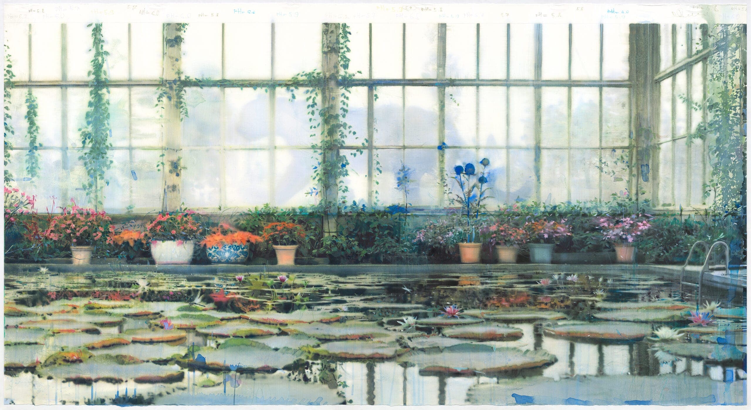 In her series Floaters, Rebus processes these crowdsourced units by freezing them with watercolor pigments, which she then allows to melt across the substrate, creating abstract color fields. She then adds figures and elements of landscape, often with a fluid, rippling effect evocative of light glinting off the surface of a lake, as aquatic themes emerge in the form of pools and swimmers. “Noon Floaters” (2025), watercolor on paper, chemical solutions, rainwater, and water samples from strangers, 140 x 300 centimeters “Nearly every sample arrives with a letter, opening a dialogue shaped by place, mood, memory, and time,” Rebus says.