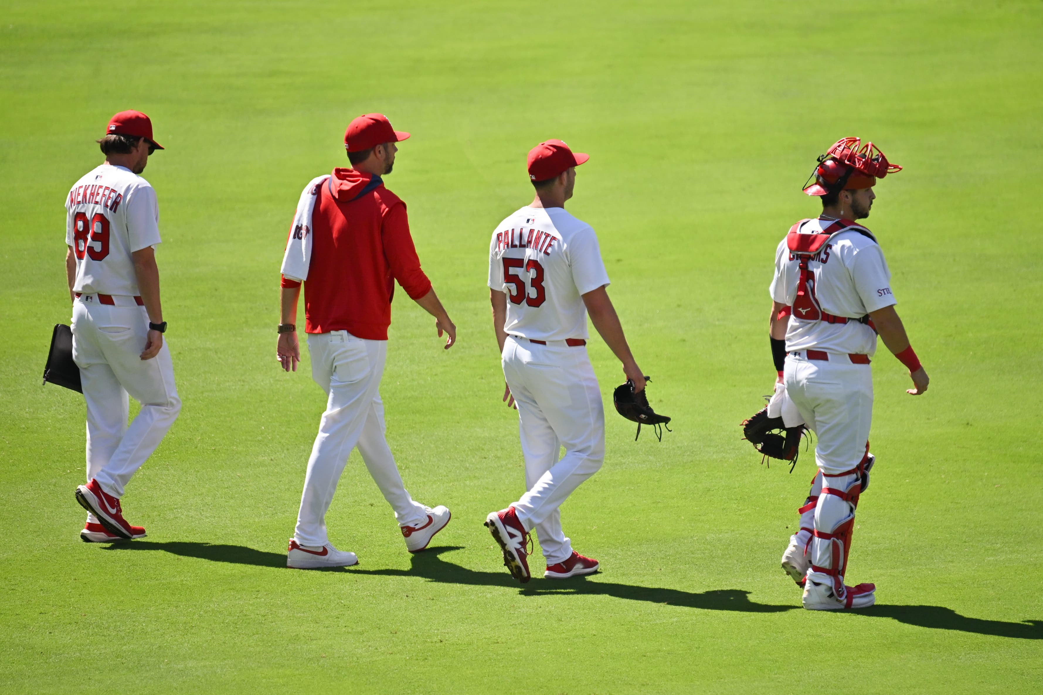 ST. LOUIS, MO - SEPTEMBER 17: Members of the St. Louis Cardinals pitching staff walk to the dugout prior to the game between the Cincinnati Reds and the St.